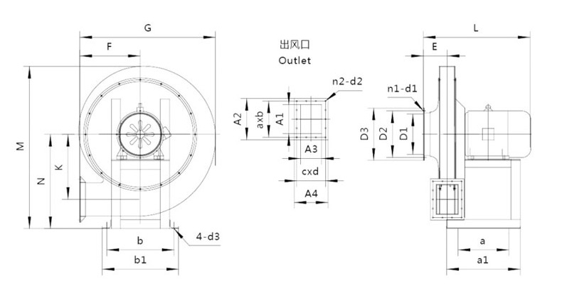 9-19 high pressure centrifugal fan is generally usedforforging furnace and high pressure forced fan, can bewidely used in conveying materials, conveying air andnon-corrosive nature, non-sticky substances and gases. The medium temperature is generally not more than 50℃ with maximum below80℃. The concentration of mediacontaining dust and particles is not more than 150mg/m3.Product type: The factory number is NO3.15, 3.55, 4, 4.5, 5, 5.6, 6.3, 7.1. It can be made into two types: right-handed and left-handed. The impeller rotates clockwise and is called a right-handed fan. Expressed as "right", the impeller rotates counterclockwise, called the left-handed fan, and is represented by "left". The outlet position of the fan is expressed by the air outlet angle of the casing. The 9-19 type fan NO3.15~7.1 is made into various types when it leaves the factory. It can be installed to the required position according to the requirements of the unit, that is, the position of the air outlet is adjusted. The range is 0°~225° or 45°, that is, (0°, 45°, 90°, 135°, 180°, 225°). NO7.1 is made into a direction angle according to user requirements. The transmission mode of the fan is A type (NO3.15~6.3) and D type NO7.1.Structural features: The fan is mainly composed of impeller, casing, air inlet, frame, chassis, bearing box and other belt drives. Impeller: It consists of 10 backward-inclined airfoil blades, curved front plate and flat rear plate. It has dynamic balance correction and aerodynamic performance, so it has the characteristics of balanced operation, small vibration, high efficiency and long service life. Housing: welded with a steel plate into a volute casing. Air inlet: made into a whole (all mold molding), installed on the side of the fan, and the axially parallel wearing surface has a curved shape, which enables the gas to smoothly enter the impeller with less loss. Transmission group: from the main shaft, bearing housing, coupling and so on. The main shaft is made of high-quality steel. The overall structure of the bearing housing is made of rolling bearings and is divided into water-cooling and oil-cooling.