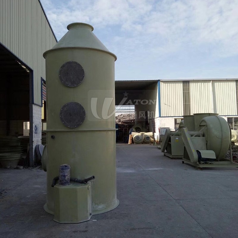 设备原理:对于腐蚀性气体(如酸、碱性废气)的治理,目前多采用液体吸收法治理。采用液体吸收法治理该废气,关键在于净化设备的选择。目前,我公司自主开发了净化效率高、操作管理简单、使用寿命长的酸、碱性废气净化工艺与设备。该工艺与产品具有结构简单、能耗低、净化效率高和适用范围广的特点,能有效去除氯化氢气体(HCl)、氟化氢气体(HF)、氨气(NH3)、硫酸雾(H₂SO。)、铬酸雾(CrO,)、氰氢酸气体(HCN)、碱蒸气(NaOH)、硫化氢气体(H2S)、福尔马林(HCHO)等水溶性气体。酸雾废气由风管引入净化塔,经过填料层,废气与氢氧化钠吸收液进行气液两相充分接触吸收中和反应,酸雾废气经过净化后,再经除雾板脱水除雾后由风机排入大气。吸收液在塔底经水泵增压后在塔顶喷淋而下,最后回流至塔底循环使用。净化后的酸雾废气达到广东省地方排放标准的排放要求,低于国家排放标准。BJT acid mist purification tower